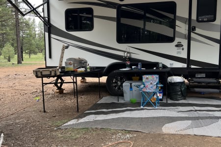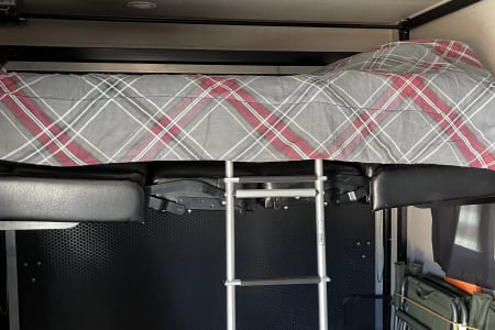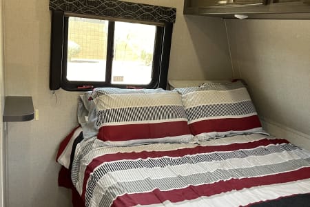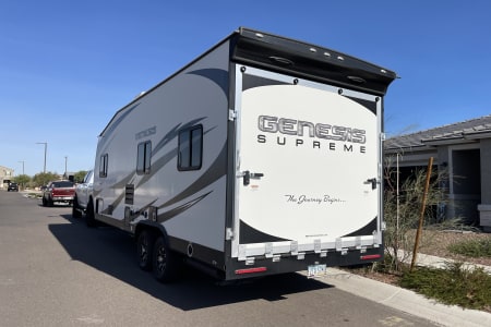 Our Genesis sleeps 6 people comfortably! It has one bedroom with a full sized bed and two queens in the back. Capabilities to turn one bed into a dinette! Electric awning, LED lights inside and out. Bluetooth radio with speakers inside and out!