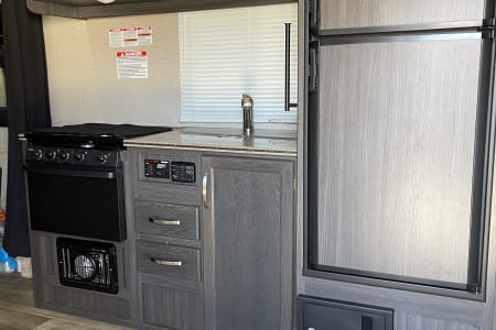 Full kitchen with refrigerator and freezer, double sink, microwave, 3 burner stove and oven.