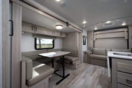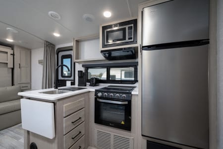 Towable by almost any vehicle on the road, the MicroLite is for customers seeking the compact and versatile option without sacrificing a luxury vacation experience. It is far lighter and takes up substantially less space than our other models, but still manages to sleep up to six people between two bunk beds, fold-out couch, fold-out kitchen table, and a Queen master bed. It comes equipped with a full kitchen, a refrigerator, a slide out, and an outdoor kitchen for those who want to spend their evening on the grill. Fully furnished, you will also find it supplied with a Keurig, a smart TV, towels, bedding, and, of course, complimentary alcohol.
