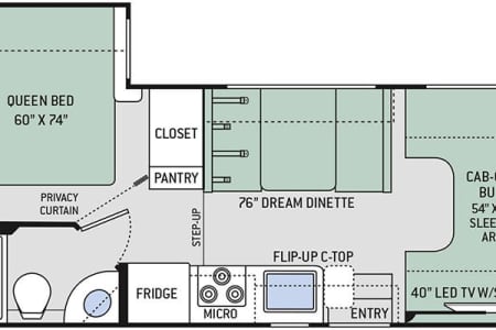 Above the cab, there is a bunk area which features 54”x96” sleeping area plus there is a 40” LED TV with a swivel arm which makes it easy to watch TV from just about any location in the front of this model. Enjoy your meals at the Dream Dinette and at night you can easily convert this area into additional sleeping space.