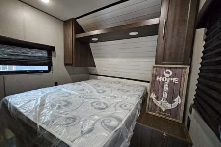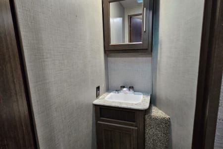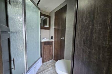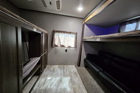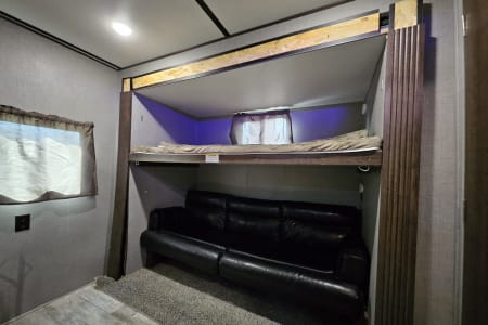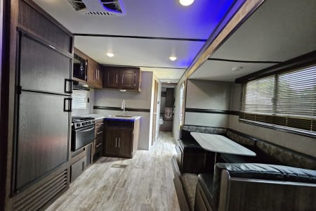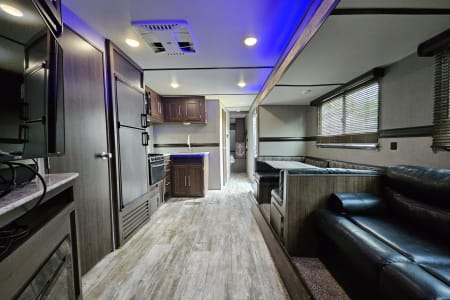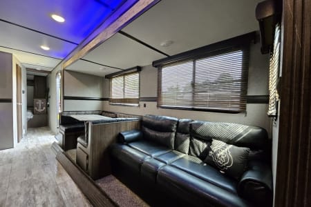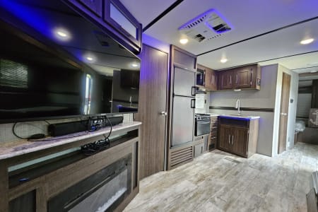 Travel trailer featuring indoor and outdoor kitchens, 1 shower, 2 slide-outs, 2 bathrooms, an awning, a flat-screen TV, an indoor electric fireplace, and A/C. It sleeps up to 10 people total (6 adults comfy). Thank you in advance for considering my RV for your fun and exciting trips!
