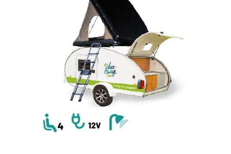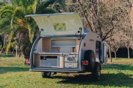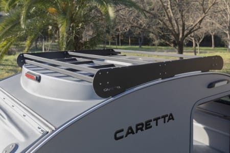 Pour partir à 4 avec sa propre voiture, la CARETTA équipée de la tente ARIZONA 2 est la mini caravane qu'il vous faut ! Matelas confortables, rangements, cuisine, frigo, évier, douchette extérieure et feu gaz !