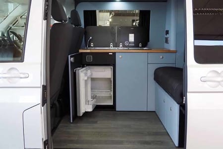 Genuine VW campervan conversion with a pop top roof. Enjoy the comfort of a modern campervan that has been fitted out with all the mod cons you will need for your camping experience including a full-width lower bed, stainless steel sink, and cupboard space plus table. A gas camping stove and electric coolbox to keep refrigerated are included.