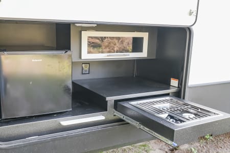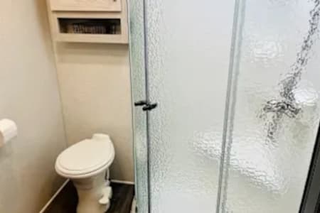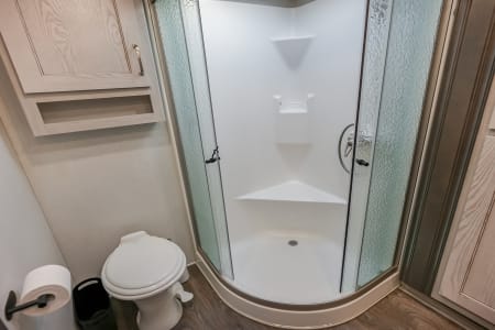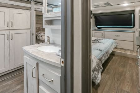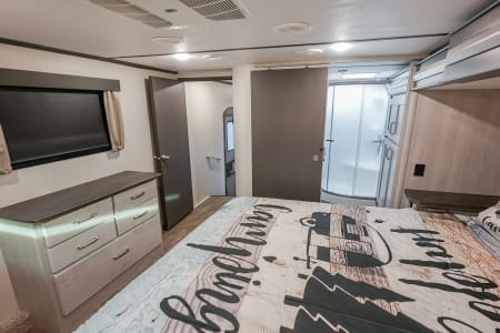 One of the highlights of this RV featuring full-sized nice sized bath with entry from hall and main bedroom, shower with enclosure toilet, and vanity, offering the comfort and privacy of home. Additionally, the outdoor living space includes a large awning, outdoor kitchen with mini fridge and electric stove, speakers, and significant storage capacity, perfect for outdoor relaxation and adventure gear.