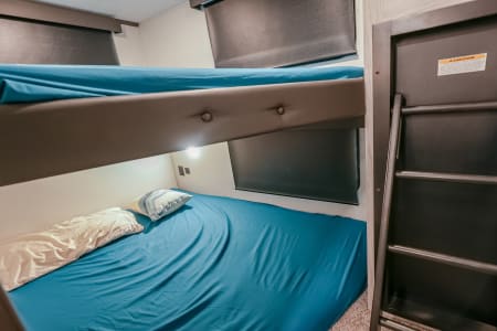 Sleeping arrangements are versatile and luxurious, including a private master bedroom with a king-sized bed, ensuring a peaceful and restful sleep. The RV also boasts additional sleeping spaces such as 2 double bunk beds and convertible sofa, making it ideal for larger families or groups.
