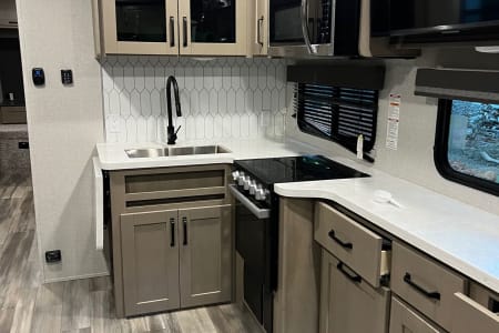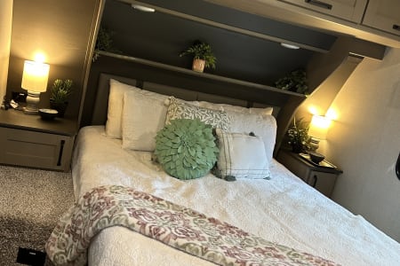 Audrey Rose is a 2024 Grand Design Reflection 296RTDS 34-foot, 50-amp travel trailer. Featuring a queen size primary bedroom with pocket door for privacy, mid rig bathroom, couch and dinette that turns into a two-person sleeping nook. We have dual air conditioners, stove, microwave, and a full-size refrigerator and freezer. Tons of storage space for all your gear!