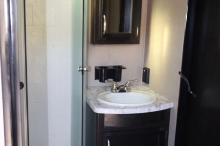 • Large Bathroom featuring a glass shower, vanity, and linen storage.