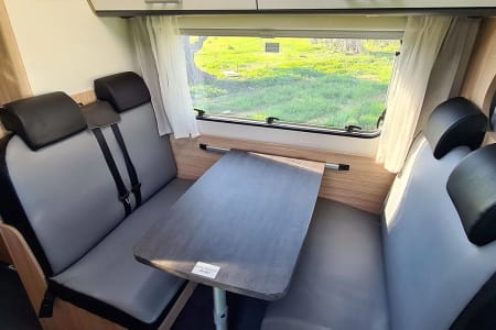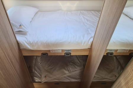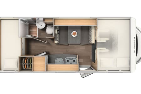 This fantastic 6 berth coachbuilt motorhome is built with the usual high standard German build quality. The spacious Sunlight A68 is excellent for families and features a modern and vibrant interior packed with the latest technology. The layout is both practical and functional and features a King size double bed above the drivers cabin and bunk beds in the rear and a double bed in the dinette. The spacious dinette can seat four people and has a total of six seat belts. The A68 boasts a large garage with enough space for all of your gear and valuables. The separate large refrigerator and freezer is a must with enough space for all of your provisions. The Combi boiler and heater can be operated on either gas or electric an efficient cost saving especially out of season.