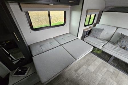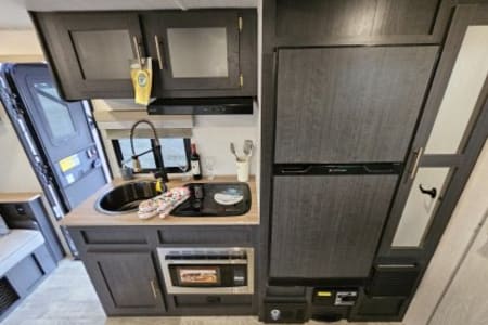 This trailer is perfect go make family memories in comfort. It has a great kitchen design with large pantry, 6cu ft gas/electric refrigerator, huge sink & tons of interior storage.