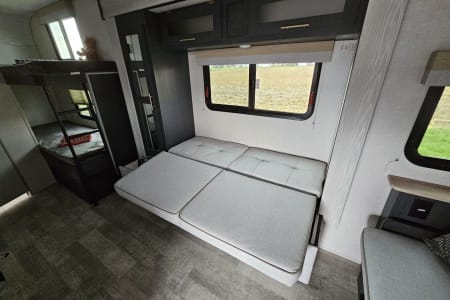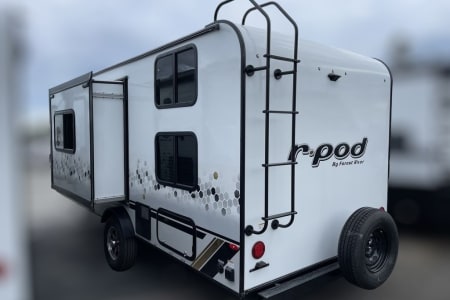 The trailer has a queen-sized Murphy bed and two twin bunk beds, sofa seating for 5 and the largest bathroom layout of any R-Pod model.