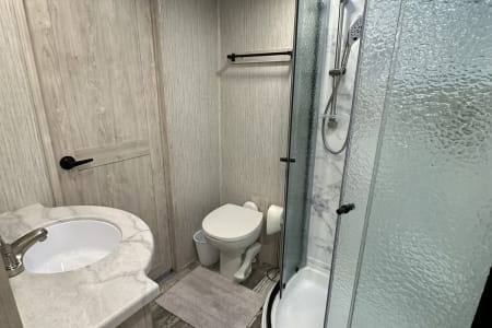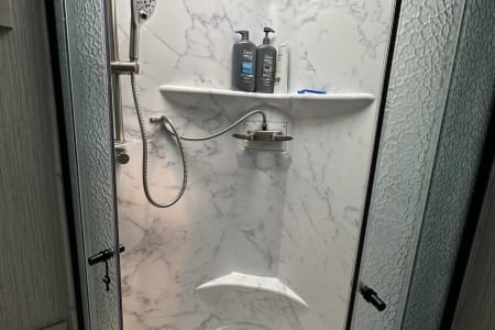 Step outside and enjoy the great outdoors under the spacious power awning, perfect for relaxing in the shade or hosting a barbecue with the outdoor kitchen. With features like an outdoor shower, solar prep, and a convenient hookup for a backup camera, this RV is designed to make your camping experience as convenient and enjoyable as possible.
