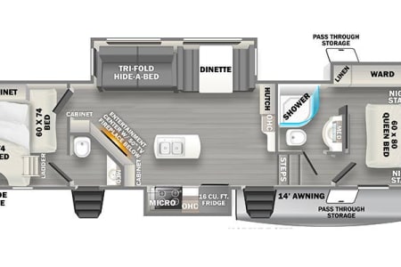 The Sierra 3440BH offers plenty of room for the whole family with its bunkhouse floor plan, providing sleeping space for up to 8-10 people. The master bedroom features a comfortable queen-size bed with storage underneath, while the bunkhouse includes additional sleeping accommodations and a dedicated entertainment space for the kids.
