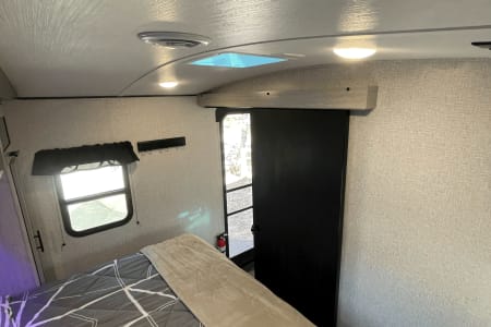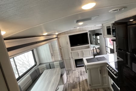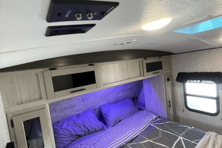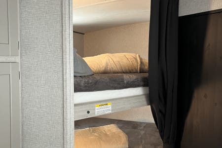 Sleeps 7 if there are 2 people on each bed (Bunk Beds, Dinette & Master). The trailer must come back as clean as it left. Currently, it comes equipped with the following:- Bedding & pillows for the bunk beds and king in the master.