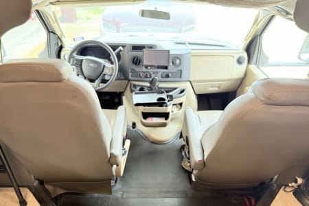 Behind the drivers area are two comfy recliners with cupholders- a delightfully comfortable space for putting your feet up after being on the road. Behind the recliners is a dinette area with under-seat storage. In addition to being used for meals and board games, this area can easily convert into a sleeping area.
