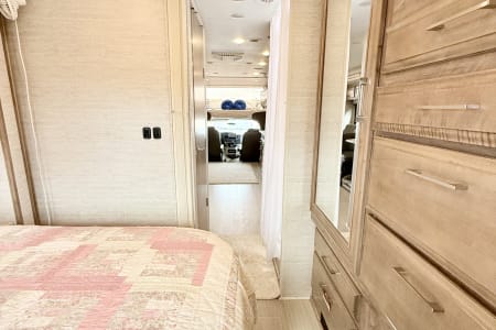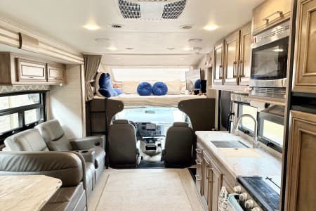Get ready to camp in comfort with our Odyssey Entegra! We chose this floorplan because it maximizes every square inch of the vehicle as usable space. While on the road with slides in, you have a clear walkway from front to back, keeping things accessible while traveling.