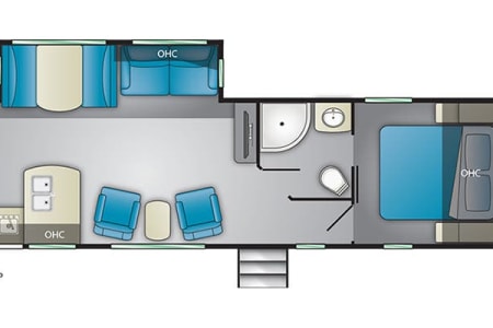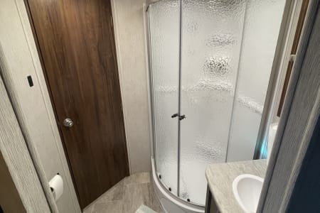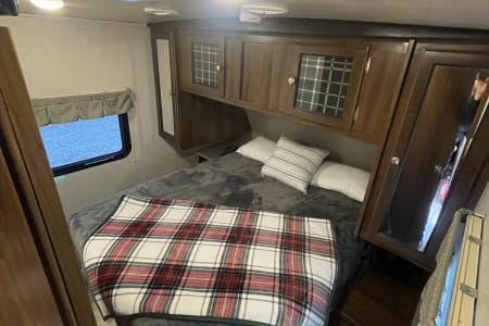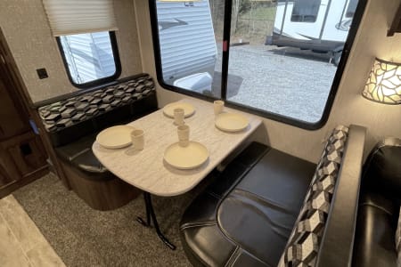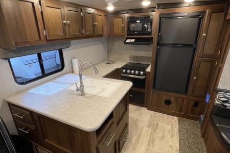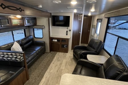 Like new travel trailer with a separate bedroom with queen bed, a fold out sofa, a dinette that converts to a bed, and two recliners. The kitchen is stocked with essential pots and pans for cooking, plates and cups for eating/drinking, and utensils. Large awning provides shade for outdoor seating. Rental includes all linens, two camp chairs, 30amp power connection, water hose, and sewer connection.