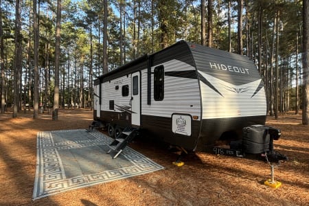 Enjoy this spacious camper that’s fully furnished for all of your needs. It is the perfect size for any ice family or group with a big queen bed up from that has its separate door to outside and two full size bunks in the back. The Jack knife sofa folds down to a bed and so does the dinette. It comes will all bedding, towels, utensils, pots and pans etc. All you’ll need to bring is your personal items and food.