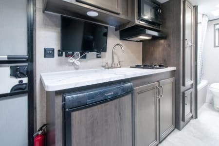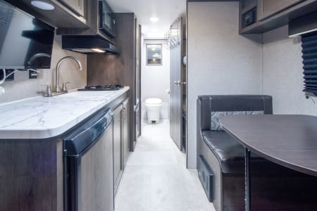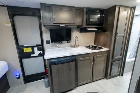 This Jay Flight SLX 7 travel trailer is similar to model 174BH, but it includes a slide out for more interior space. The bunk beds include 4"-thick bunk mats for comfort, and the front queen bed includes a privacy curtain for your own space. Easily prepare your meals on the two-burner cooktop, or use the convenient microwave oven. This mode includes a private bathroom so that you don't have to use the camp's facilities, plus you'll find plenty of storage, including overhead compartments, a pantry, and outside storage!