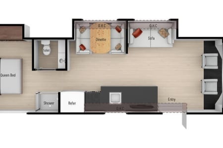 Sleeps Up to Seven – Get a restful night’s sleep with a queen-size master bed, cab-over bunk, convertible sofa, and a dining table that transforms into a bed.