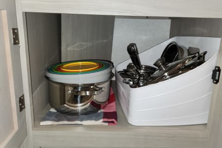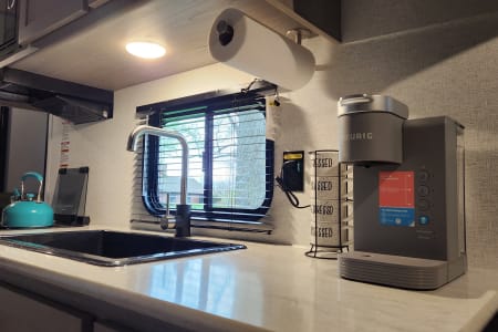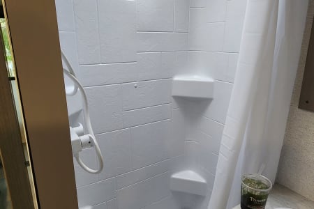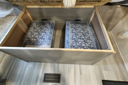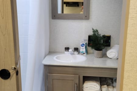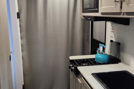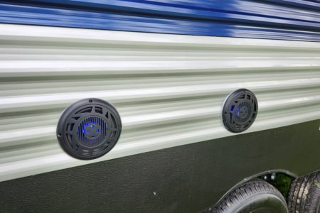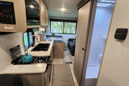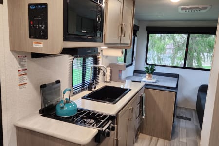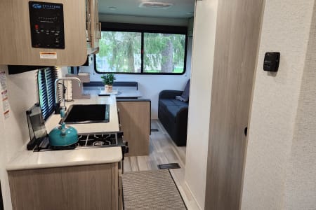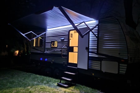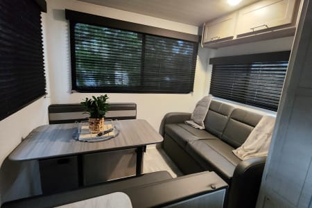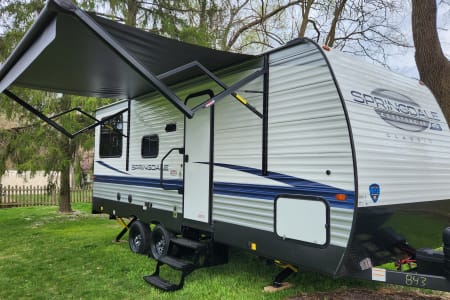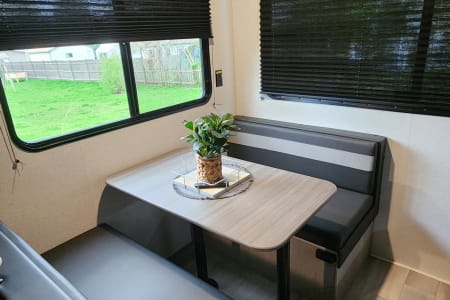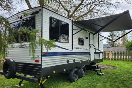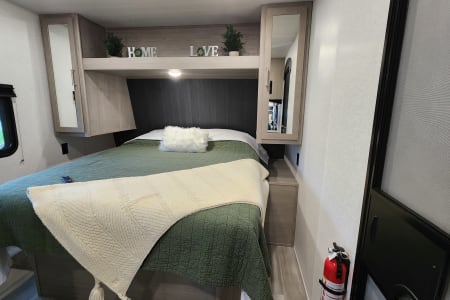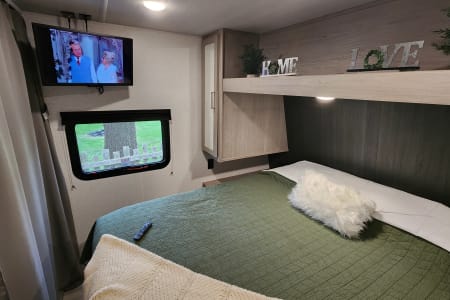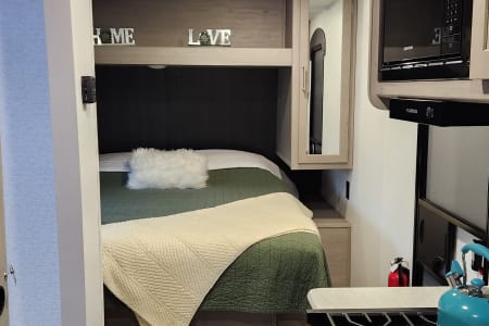 We are excited to share our 2024 RV Trailer. It is on the lighter side of RV trailers, and it's equipped with all the things that you need for a comfortable vacation experience. Includes a mounted solar panel. There's a queen bed that also has a curtain for privacy. Power stabilizer. Three big windows surround the sitting area of the trailer.