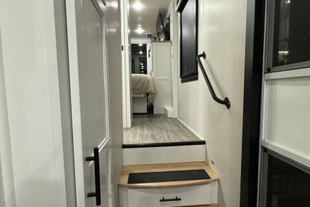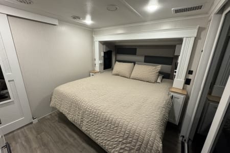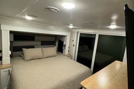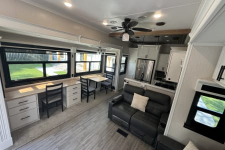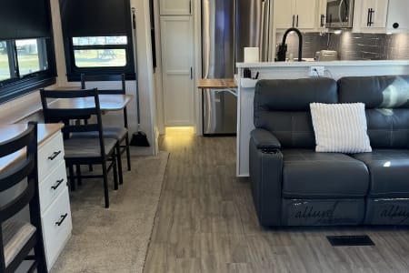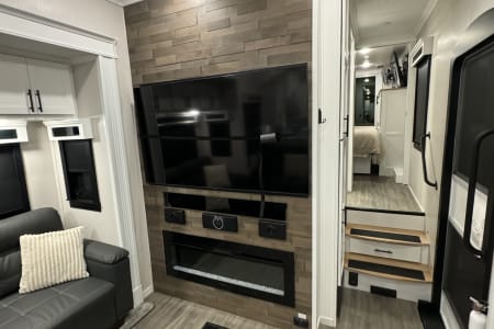 Enjoy the beautiful outdoors while camping in style in this beautiful Riverstone Reserve RV! This RV boasts a tremendous rear kitchen open to the living area which includes a residential refrigerator/freezer, ice maker, microwave, stovetop, oven, and a substantial amount of cabinet/pantry space! The kitchen is open to the main living area which makes it great for socializing and making sure everyone will have great views of the main TV for watching the big game! Enjoy your meals outside or at the inside kitchenette! This model also includes an awesome full size desk in case you need to bring work or school along on your journey! The living room boasts a set of double recliners and a sofa that doubles as a pull-out bed, a large smart TV & a cozy fireplace! It also has a luxurious bath with double sinks and a full size shower! Enjoy a good night’s rest in this spacious bedroom, equipped with a king size bed, nightstands, a dresser, full size mirror, spacious closet, & TV! If you don’t want to spend all your time inside “glamping”, make sure you enjoy the outside entertainment, including an outdoor TV, double awnings, and beautiful accent lighting to create the perfect ambiance to wind down at night after a fun, full day!