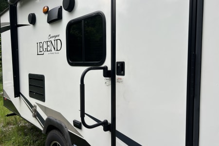 Available for booking is our Surveyor travel trailer named "The Legend." With comfortable, ambience and added amenities! Driver side slide out. It comes with a 3 burner stove, a refrigerator, a microwave, a shower and tub, heat and A/C, bunk beds, a Queen sized bed and dining table that converts into a bed, board games, TV and an automatic awning as well! Cookware and cooking utensils are provided as well as clean linens with every stay. Propane tanks included for use. Included is also a weight distribution hitch for peace of mind when towing. Looking forward to your booking!