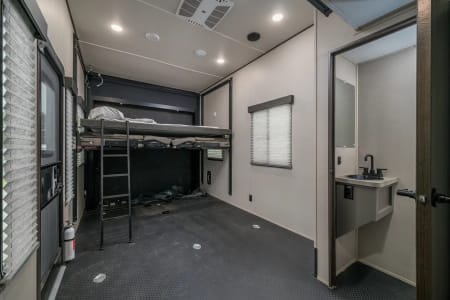 A supremely luxurious ToyHauler with a fire place, residential-size refrigerator, white marble countertops, smart TVs, and two walk-in bathrooms. Its three queen-sized beds in the second bedroom and single king-size bed in the master bedroom make it a good option for accommodating large parties.