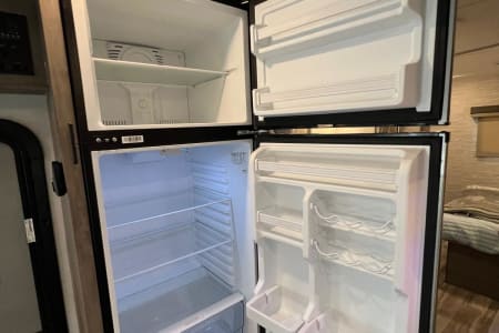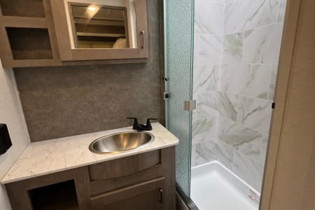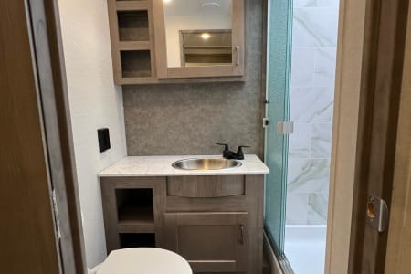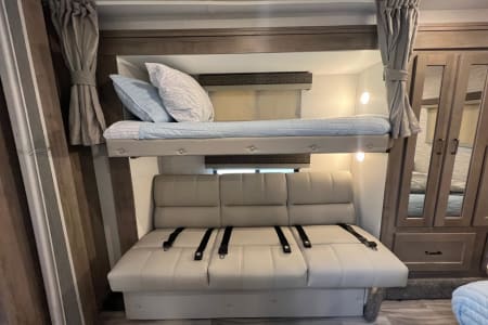 There is a set of bunk beds across from the full bathroom with a shower, toilet, and a bunk over the cab. If needed, additional sleeping space can be created on the jackknife sofa and booth dinette that can convert to a bed.