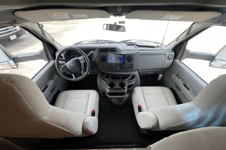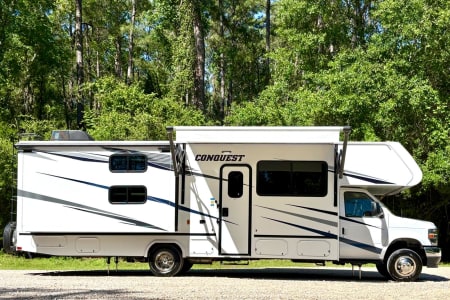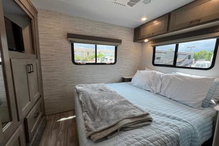 She is powered by a Ford E450 V8 engine. It has two slides and plenty of exterior and interior storage throughout. The rear master bedroom has a queen bed, wardrobe cabinets, drawers, overhead cabinets, and a TV.