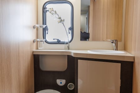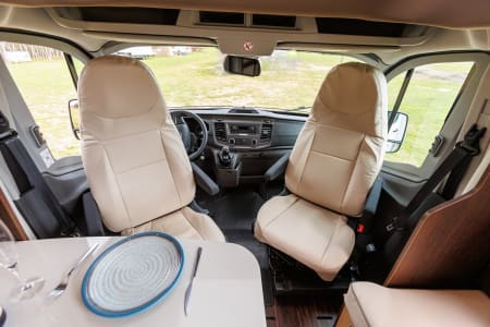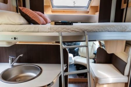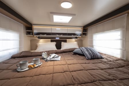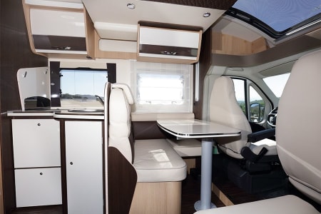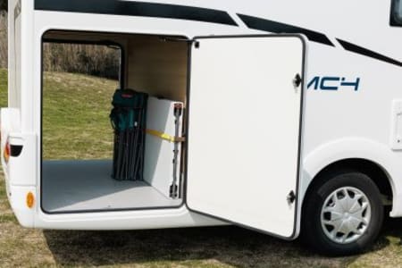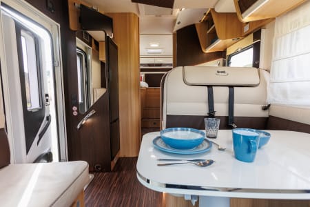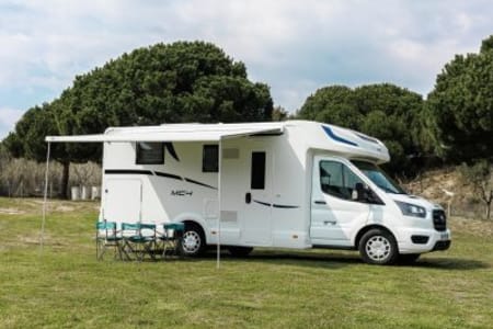 Autocaravana con capacidad para 5 personas. Incluye: menaje, vajilla, mesa y sillas ext, cafetera, duchas int, gas y electricidad.