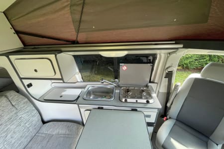 - Un store dépliable sur le côté du van vous permettra de déjeuner ou vous reposer à l’extérieur