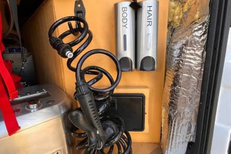 - 16-gallon water tank (for sink + outdoor shower)