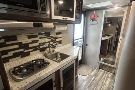 Features Include: Electric Tongue Jack, 1 Slide-out, 1 Air Conditioner, 2 propane tanks, Awning, Outside Speakers & Radio, Outside Shower, Queen Mattress, 2 Twin Beds (Bunkhouse), Dinette (converts to full bed) with underneath storage stocked with towels, puzzles, cards, activity books and magazines. Freezer/Refrigerator, Microwave, Sink, and 2 Burner Range. Kitchen stocked with utensils, plates/cups, pots, pans, seasonings, soap & towels.