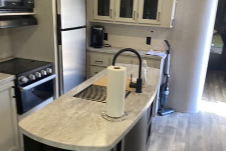 As you walk in, you'll notice a full kitchen with an island that includes all your cooking essentials from microwave, oven, full RV size top-freezer refrigerator.