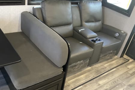 A wide-open RV layout provides two slide outs to enjoy a roomy interior. The living room includes a 40-inch smart TV, JBL Bluetooth stereo system, fireplace, a couch for two guests, and two reclining massaging seats. There are three massive windows that make you feel one with nature.