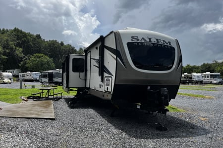 Enjoy all there is to offer in the Asheville surround area in your own private camper. We offer a fully stocked suite with a center island living area, dual A/C, fireplace and a room totally for the kids.