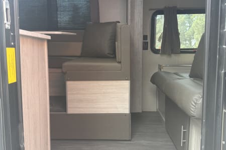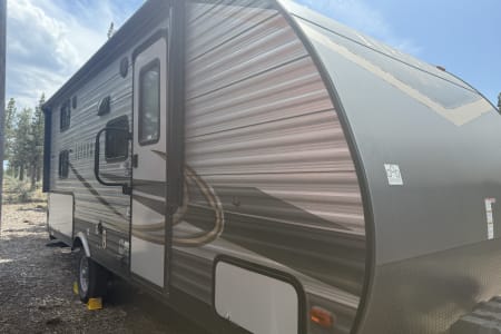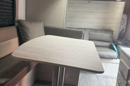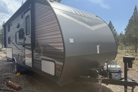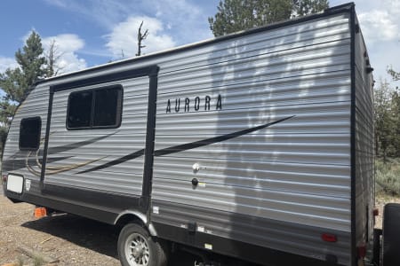 The Aurora Bunkhouse, a NEW and comfortable trailer. Classy and cozy. Sleep 6. Has a queen bed, 2 bunks, and a dinette conversion. Trailer is fully stocked with all kitchen necessities, bathroom necessities, linens for 6, chairs for 4, board games, and much more, all to make your camping trip a success. Enjoy the evening glow with a LED awning and Bluetooth outdoor speaker. Solar power in addition to shore power option. Generator upon request. Pet Friendly. Take this bunkhouse on your next camping dream adventure.