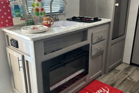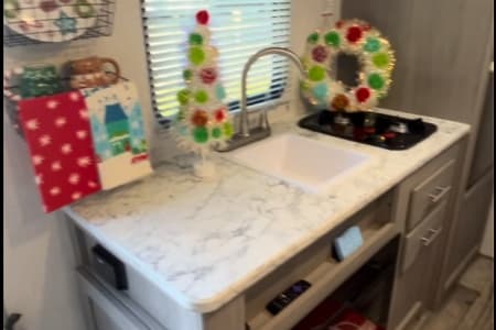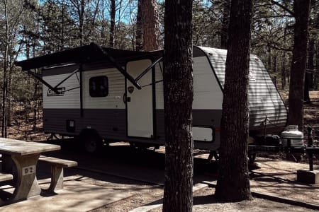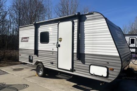 Camper comes with chairs, indoor and outdoor games, coffee pot, etc. We have a full kitchen set up for you including cups, plates, and all your cookware needs. Will deliver for a fee. This simple yet fresh and cozy camper has all you’ll need to get outdoors.