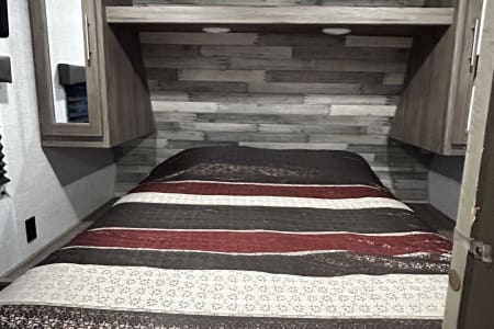 Sleeps 9; queen size master bed, 2 single bunks, 2 double size fold-out couches and kitchen table converts to bed. 88 gallon black water tanks, 44 gal gray water tanks & 51 gal fresh water tank. RV Rental Delivery and Set-up. Generator available for fee if primitive camping.