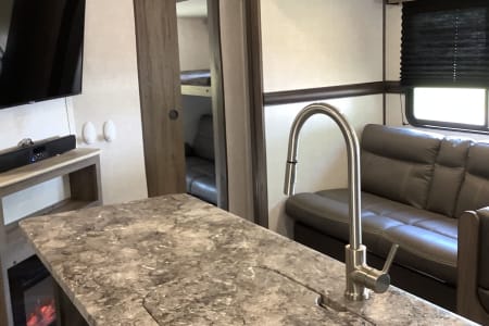 There are 2 tv’s inside, Am/Fm/Bluetooth sound bar with indoor or outdoor speakers. USB docking stations in both bedrooms and family area