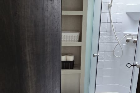 A smaller footprint makes for an easier tow and setup. Included in the rental comes with a wireless 7-inch screen backup camera to assist with the safe operation of the trailer. The camper comes with all your needs from home, including a stocked kitchen with basic pots, pans, and dining wear. There is a comfy couch, and a corner glass shower. Privacy curtain for the queen bed for those who need a little separation from the little ones on your trip!