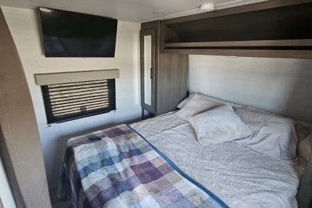 Camping with friends or family is easier than ever in this spacious travel trailer. You can easily sleep nine with the double-size bunks, the 60" sleeper sofa, and the queen bed in the front private bedroom. The booth dinette can even be used to sleep a guest or two little ones. Prepare your meals on the three-burner cooktop indoors or on the two-burner cooktop at the outside kitchen! You'll also find an exterior spray port, and a 1.6-cu. ft. outdoor refrigerator for drinks! It will be so easy to fill the dog's food bowl with the added pet dish under the refrigerator, and the full bath in this model means you don't have to use the camp's facilities.
