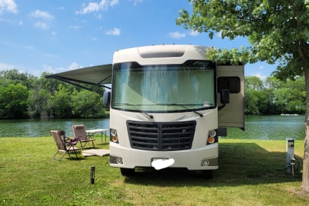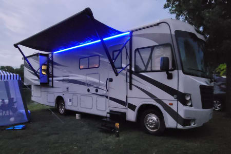 No special license needed to drive this smooth 31' Class A Motorhome! Park easily with automatic leveling jacks and side and rear view cameras. Enjoy the spacious interior with two motorized slide outs. One slide out is in the bedroom, which features a comfortable king size bed. RV features three TVs, one in bedroom, one in living area, and one on the outside. It also features a double kitchen sink, three burner stove, small oven, microwave, air conditioning with overhead vents throughout cabin, heating, fans, vents with "Max Air", water pump, water heater, refrigerator, generator, outdoor shower head, storage compartments, bunk bed, motorized awning, motorized blinds for windshield and speakers for music throughout.
