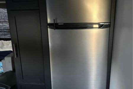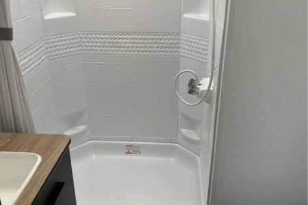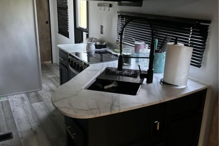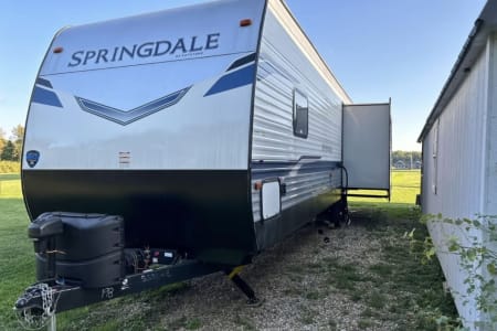 Our camper sleeps 6-8 people. The back bedroom is a queen bed, the dining room has a converting dinette and the sofa is converting, both are equivalent to a twin size. There is also space large enough on the living area floor for a queen size air mattress which we have stored in there for use. The living area has a love seat size sofa and two recliners. The kitchen has a fridge, freezer, microwave, stove, oven and sink. The bathroom has a toilet, sink, mirror and shower. There is a tv, radio with Bluetooth, dvd player, fans, air conditioning, heat, and lots of storage. The outside of the camper offers an awning, outdoor shower, outdoor speakers and lights.