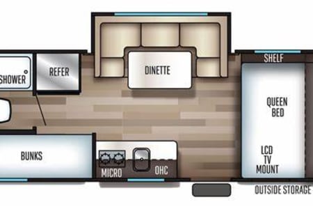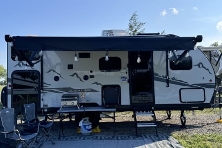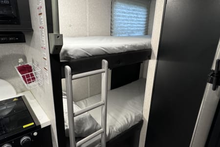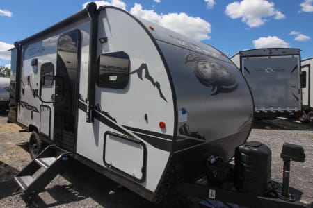 Welcome to the Wolf Pup Bunk House. This is the 2022 Wolf Pup Black Label Camper with the Adventure Package. This is a perfect couples/small family camper. It sleeps 6, is 22 feet long, and the weight of the camper fully loaded is about 4300lbs. So, it’s half-ton towable. It’s a fully equipped camper ready with everything you need to enjoy camping. It’s equipped with a bunk house for the kids and a queen-sized bed up front, and a large u-shaped dinette which also converts to a bed if you need it. There is a bathroom with shower and toilet. There is a driven entertainment system with speakers mounted inside the camper and on the outside and a smart TV and DVD player with several movies.