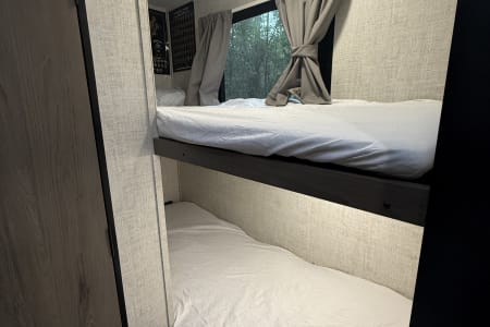 Sleeps up to 5 people comfortably, with a cozy queen bed, a bunk bed and a convertible dinette.