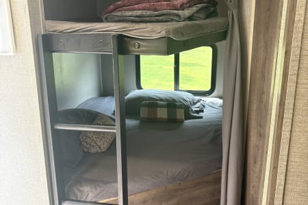 Welcome to The Rookie - 2019 Aspen Trail travel trailer. This rig sleeps 6-8 comfortably with a queen size master, two bunks, convertible dinette and a fold down couch. Kitchen is fully stocked with all you need for your stay. The bathroom has a tub/shower combo with bathroom necessities. Includes 32" TV in the living area, indoor/outdoor sound system with Bluetooth, radio, or CD capabilities. Enjoy the outdoors under the electric awning with LED lights or hang inside with cool air conditioning or heating to ensure your comfort in any weather. This camper is the perfect set up for families. Rig is always delivered and set up with complete walk through instructions.