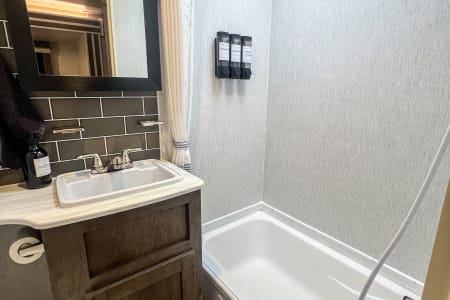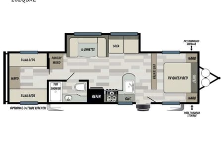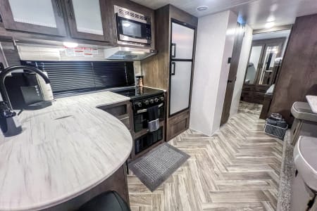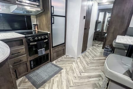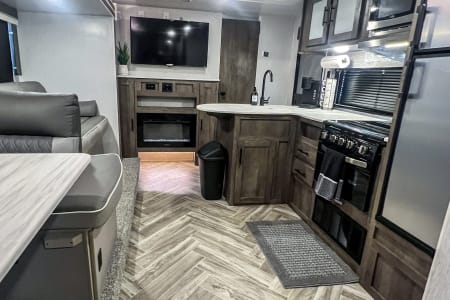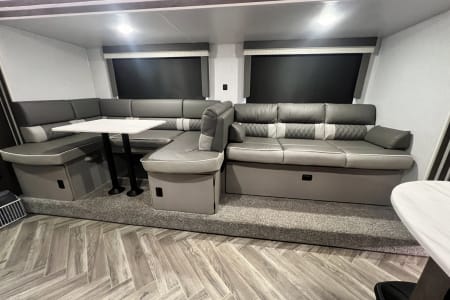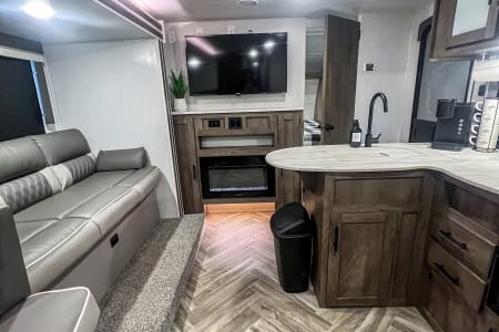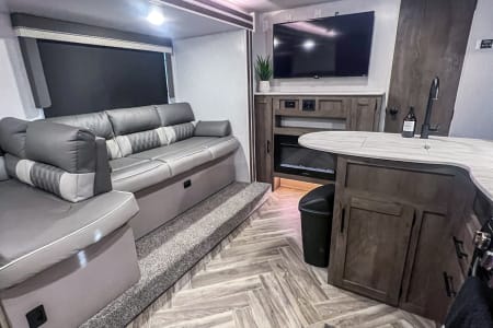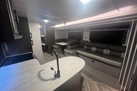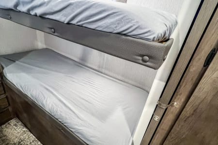 Get ready to go on an adventure with the whole family! This travel trailer sleeps 9 total with two separate bedrooms. 1 Queen in the Master, 2 bunk beds totaling 4 twin beds in the back room, a pull-out sofa bed that sleeps 2, and the dinette that can sleep 1-2. It has a TV in the Master and the living area if you have a hotspot to watch tv. Most campgrounds offer free WiFi. The radio has Bluetooth AM FM. It connects to the speakers inside and outside the trailer. It also has a mini fridge and flat griddle on the exterior. The sofa can turn into a chaise sofa which also creates a smaller dinette. If you want a bigger dinette, all you need to do is adjust the back piece to create a smaller sofa and larger dinette. There is one slide out on the driver side. This home away from home has everything you need.
