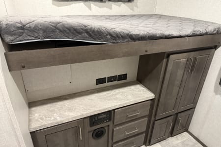 The master bedroom is spacious and you will not have to do the camper shuffle to make your way around the queen size bed. It has plenty of drawer space which also includes a wardrobe with mirrors on the door. There are outlets and small shelves next to the bed perfect for cell phones or a CPAP machine. If you need a little extra light without disturbing your partner there is a small reading light over each side of the bed.