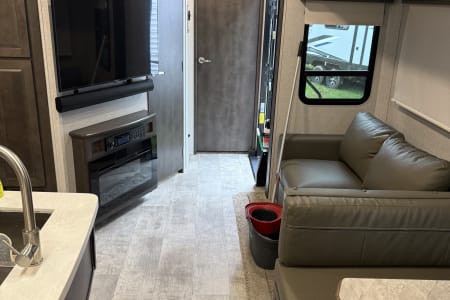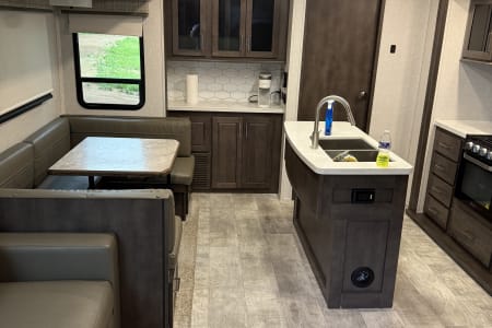 Walking out of the master bedroom in the the main quarters of the camper you’ll have a jack knife sofa that easily converts into a bed that will sleep 2 people. Across from the sofa is ann entertainment area that includes a wall mounted t.v. and a fire place. Inside this same area you have a beautiful kitchen with a 4 burner stove, oven, full size microwave refrigerator and freezer. In the island you have a double basin sink with counter top space. Working your way around the room there is a pantry, base and wall cabinets that are fully stocked with all the things you’ll need for stay. The dining room table is along the wall with windows to enjoy your view. It also converts into a bed to be able to sleep 2 more people.